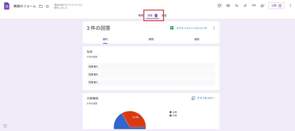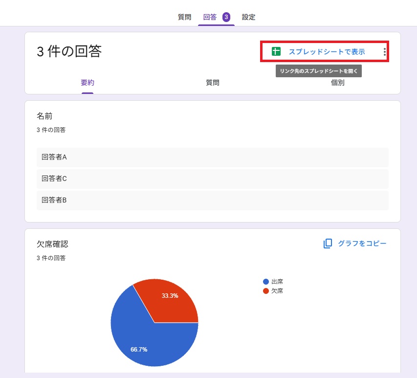 開き方は「回答」→「スプレッドシート」をクリックします。