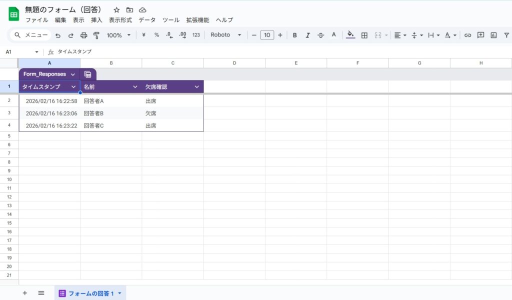 フォームの回答は自動的にスプレッドシートに記録されるため、誰が出席するのか一目で把握できます。並び替えやフィルタ機能を使えば、必要な情報をすぐに抽出でき、集計作業が格段に効率化されました。