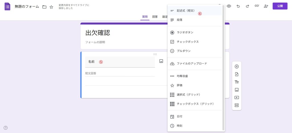 ⑥ 説明用の質問1は名前なので「記述式(短文)」を選択しております。