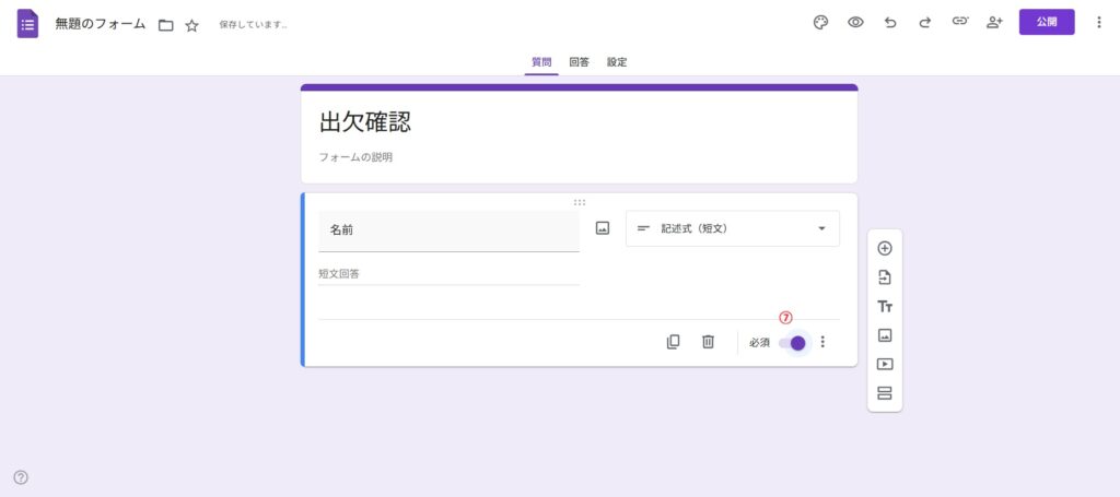 ⑦ 必ず回答してほしい内容は「必須」に設定します。