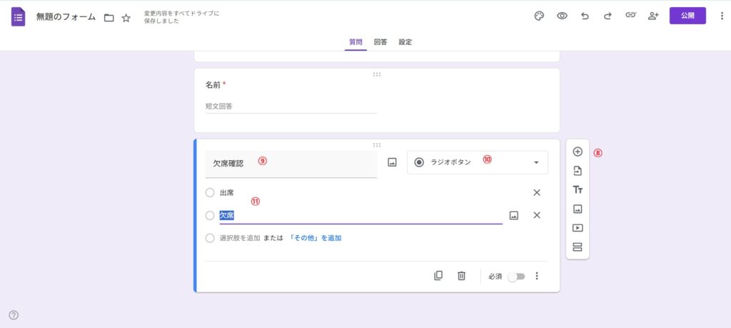 ⑩ 質問内容の出欠確認は「出席」か「欠席」の選択なので「ラジオボタン」にします。