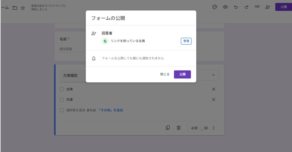 画面右上の「公開」をクリックしフォームの公開ウィンドウが表示されますので、「公開」をクリックすると回答を受け付ける状態になります。