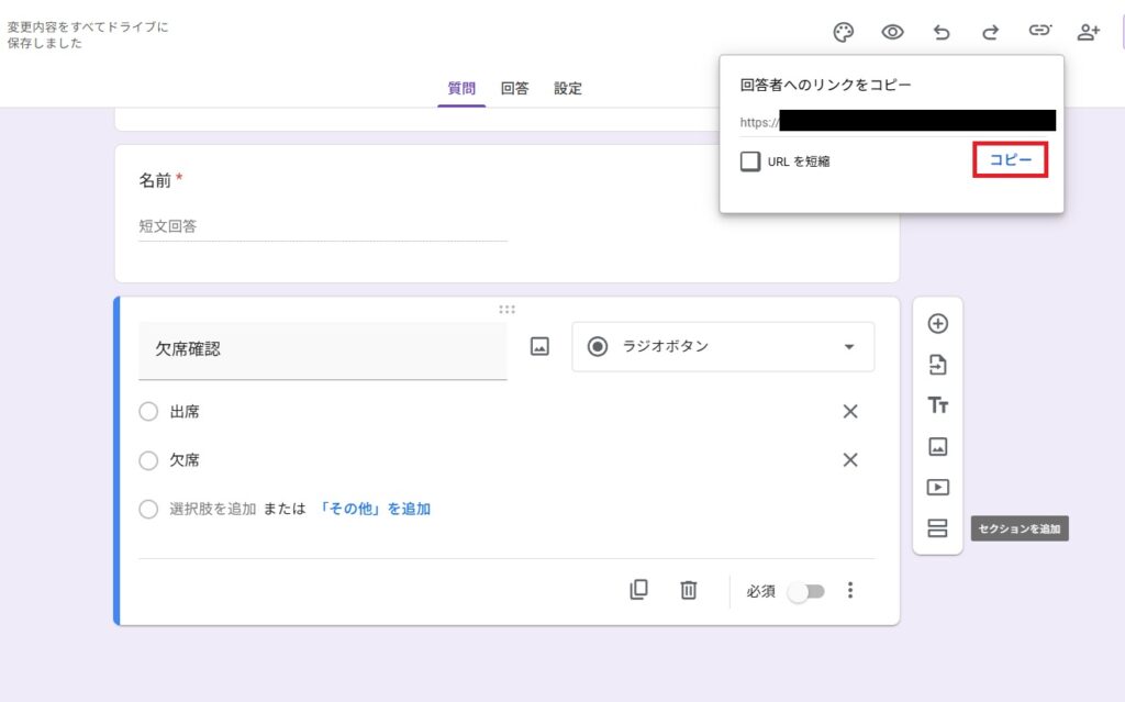 公開をすると回答者へのリンクをコピーが表示されますので「コピー」をクリックして