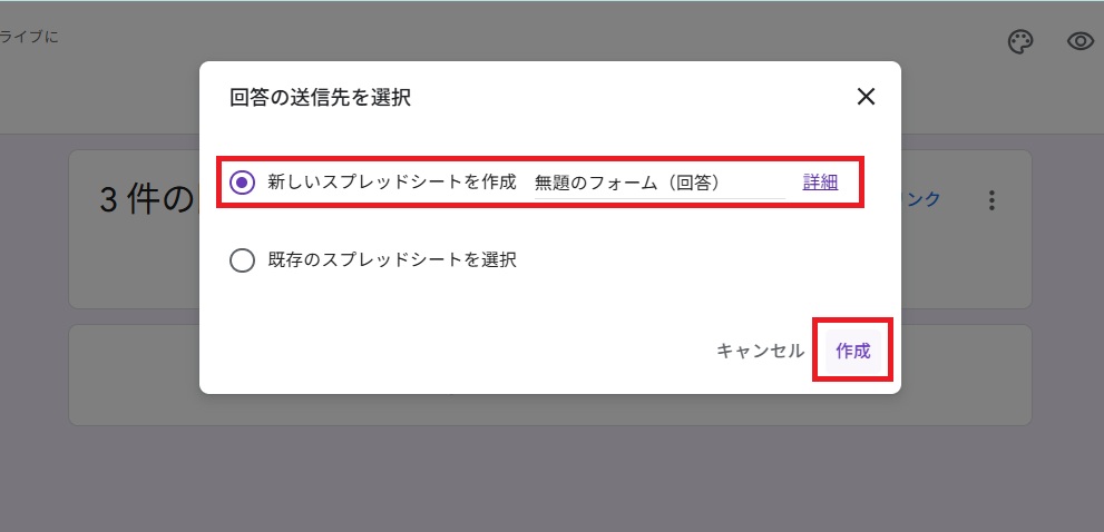 回答の送信先を選択時に「新しいスプレッドシートを作成」を選択し「作成」をクリックします。